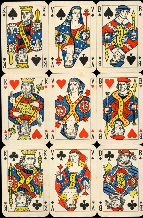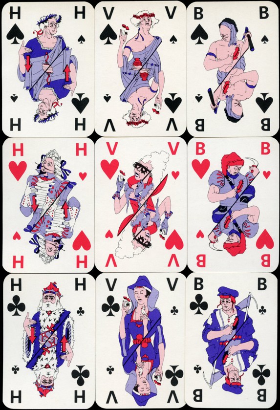Repeated series of 4 designs on aces and courts. Unusual suit signs, all