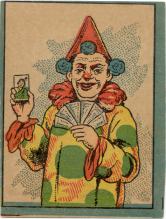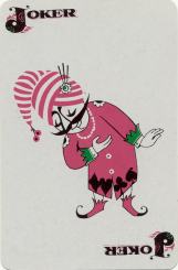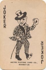 These last 2 jokers don't fit in, we know, but they are too cute to leave out. They come from an educational deck of cards (made in India ca. 1945), with suits and denominations, but also with a special object drawn on each card, together with the Singhalese (?) word for that object. The decks were hand cut and that shows.........