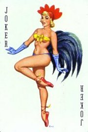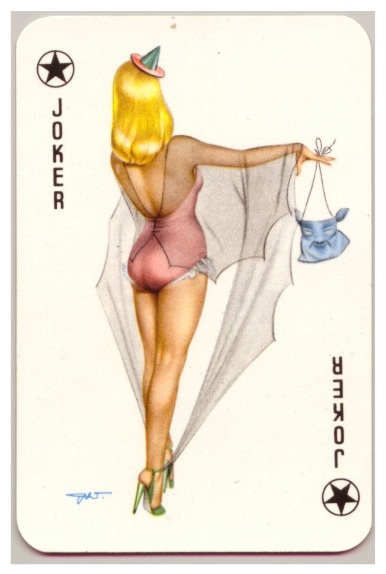 It originates from a pinup deck that was printed by the Bielefelder Spielkarten Fabrik (logo: JOKER ) in 1957. The deck was published as "Darling" playing cards. The drawings were done by Heinz Villiger.