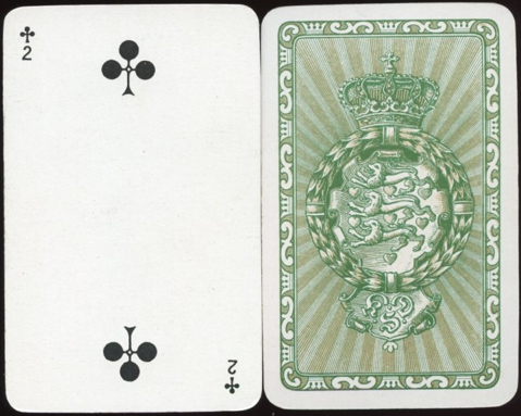 The deck had been used for piquet or skat or any game that only requires 32 cards. So the 2's to 6's hadn't been used. Hence the bright white C2 and back with the coat of arms of Denmark here. |