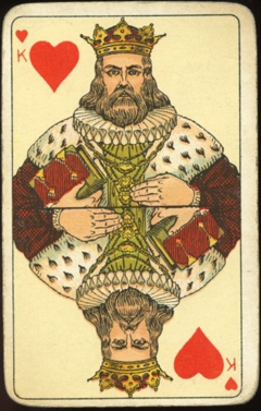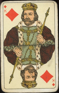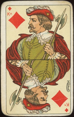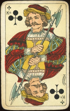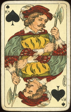 So it's pure coincidence that this deck was made by the same manufacturer as last month's: Kruckow from Copenhagen, Denmark. The deck was first published as "Danske Spillekort" around 1904 and has known several later variations. When I started doing my own research, I found that the deck below is described in Jensen as 9.04. Because the previous owner had described it as 9.01 (c 1904), I checked my finding with Ali Jerremalm and he concurred. Because Ali has this variation in a hombre version, he couldn't say for sure that a 52 cards deck of this variation didn't come with a joker. But it's likely that it didn't. The first joker accompanying this pattern is shown by Jensen in variation 9.08.