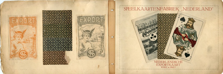 The SN deck came with a set of international aces. In a recently received sample book it's titled "Nederlandsche Exportkaart" and was available in whist and piket, a game for 32 cards. The wrappers show the SN logo, but the content was the old NSF stock, for which a more rigid sort of carton was used. |