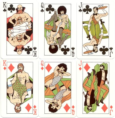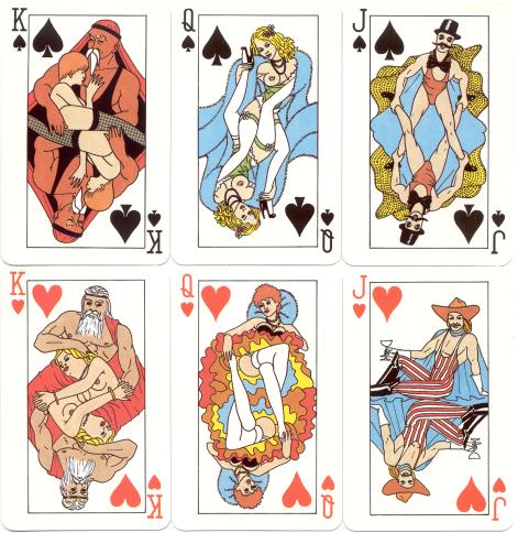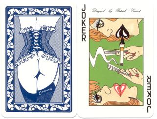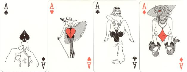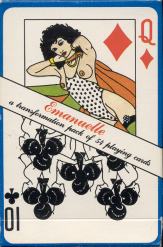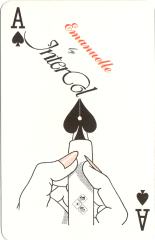 This transformation deck was published by Intercol from London as "Emanuelle" in 1986. The designs were done by Patrick Cuenot. The courts are in full colour, all transformational pip cards in red/black. The deck consists of 52 cards, 2 jokers, and 2 extra cards. One of the extra cards is an Ace of Spades as title card. The deck comes in a carton box.
