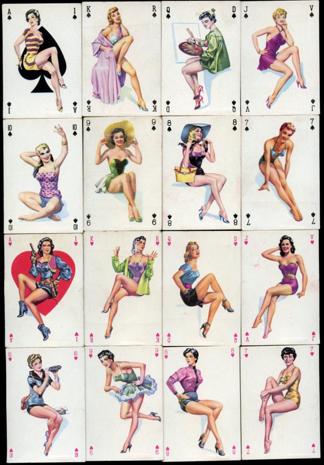 different pin-up design. No joker. Artist unknown. Deck is in very good condition.