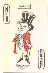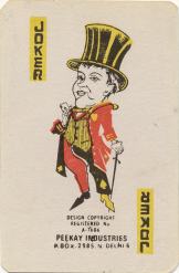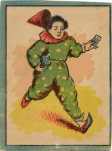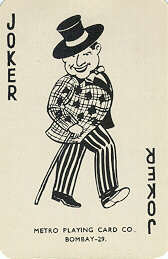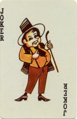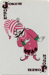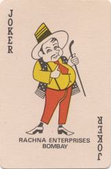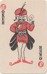 These last 2 jokers don't fit in, we know, but they are too cute to leave out. They come from an educational deck of cards (made in India ca. 1945), with suits and denominations, but also with a special object drawn on each card, together with the Singhalese (?) word for that object. The decks were hand cut and that shows.........