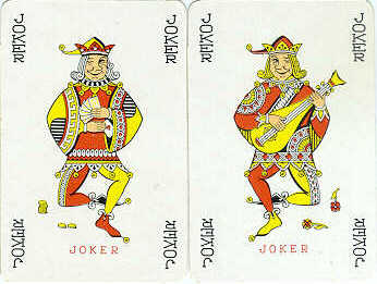 The one on the left is a rare mirrored version of the company joker V. It comes with the Neerlandia "B" deck (SN19). With the Neerlandia "C" decks sometimes this joker appears without text.