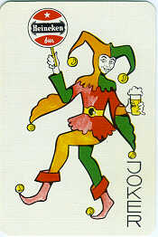 The Heineken joker too was later made by a Belgian manufacturer. Here the difference is that the letters of the word joker are a little bigger and therefor the letter "R" ends clearly below the foot next to it. In the Belgian version a smaller letter is used and the "R" ends just a little below the foot. Also the whole SN card is a little bigger. Check your collection, jokerfans!