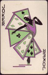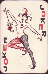 John Daniels from Melbourne, Australia: "Here are my two favourite jokers. First joker is from the USA, and sums up the Deco style perfectly; stylish and graceful and beautifully colored. It is from a 'contraband' deck issued during the prohibition era in the 1920's and features liquor bottles on the back. Second is from a UK pinup deck "What The Butler Saw" and is just a magnificent design - simple yet effective!".