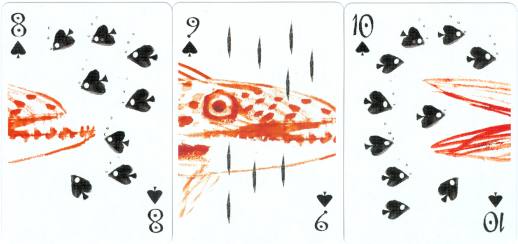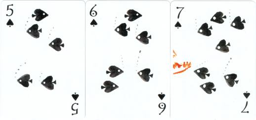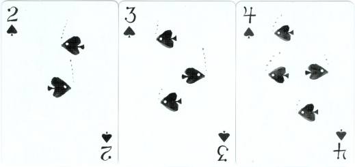 The pips can be seen as a flip-over book. From the 2's through the 10's each card is a stage within a story, which often has a surprising end.