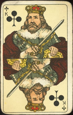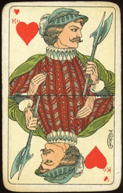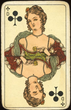 So it's pure coincidence that this deck was made by the same manufacturer as last month's: Kruckow from Copenhagen, Denmark. The deck was first published as "Danske Spillekort" around 1904 and has known several later variations. When I started doing my own research, I found that the deck below is described in Jensen as 9.04. Because the previous owner had described it as 9.01 (c 1904), I checked my finding with Ali Jerremalm and he concurred. Because Ali has this variation in a hombre version, he couldn't say for sure that a 52 cards deck of this variation didn't come with a joker. But it's likely that it didn't. The first joker accompanying this pattern is shown by Jensen in variation 9.08.