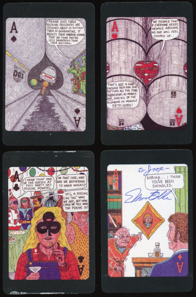 On both jokers and the back design E. Michael Blake has drawn a self portrait of himself with a joker hat.