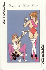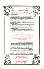 This transformation deck was published by Intercol from London as "Emanuelle" in 1986. The designs were done by Patrick Cuenot. The courts are in full colour, all transformational pip cards in red/black. The deck consists of 52 cards, 2 jokers, and 2 extra cards. One of the extra cards is an Ace of Spades as title card. The deck comes in a carton box.