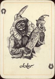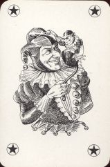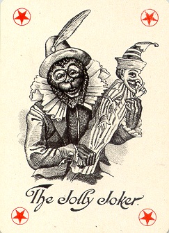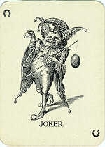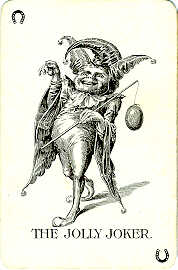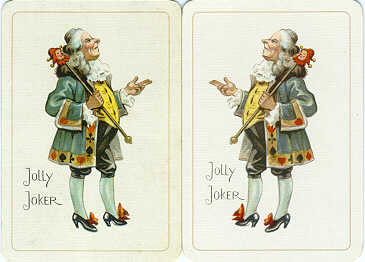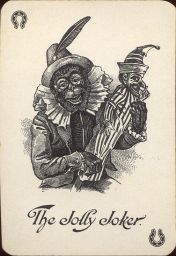 Between 1920 and 1925 the "monkey joker" began a long career with lots of variations. They can be seen with several decks on expo. The oldest ones have horseshoes in the corners. There are variations with "THE JOLLY JOKER" and "JOKER" under the figure. With the Trianon deck (SN16) the word "JOKER" was placed next to the monkey's head. In the New Liberty deck (SN13) the manufacturer has put his name vertically next to the monkey. Later black stars were put in the corners.