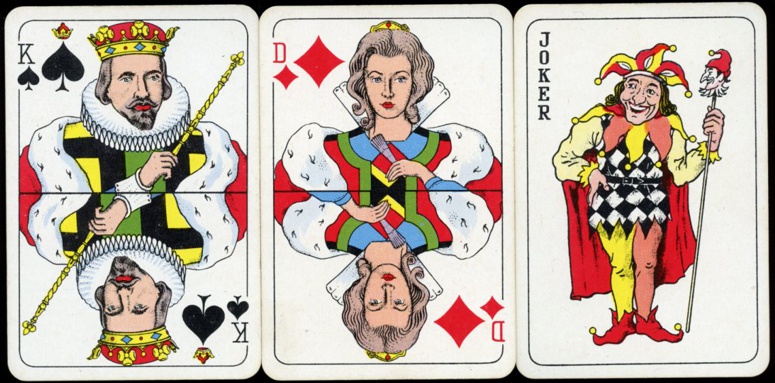 52 cards, 3 jokers (2 double imaged) and a blank card, all in excellent