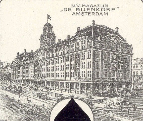 The department store of the Bijenkorf (Bee Have). It's the most important department store in Amsterdam. It was build in 1911 on the spot where the old bourse building had been. Here the store is depicted in b/w on the ace of Spades from an advertising deck for the Bijenkorf concern, that was made by the Speelkaartenfabriek Nederland in the 1930’s.