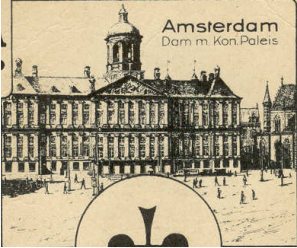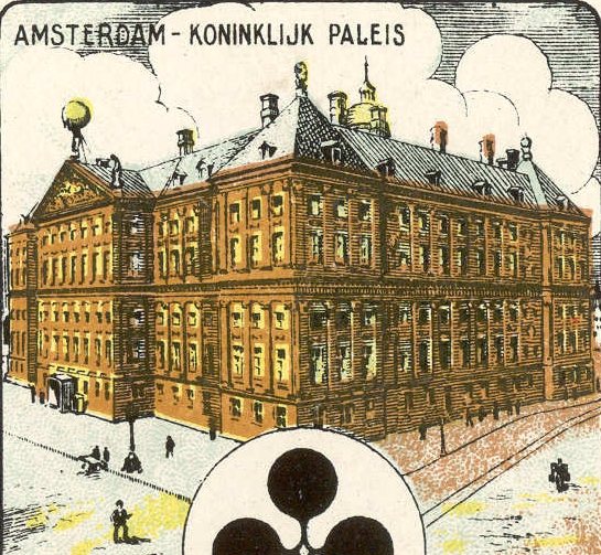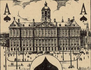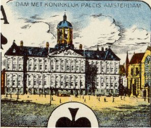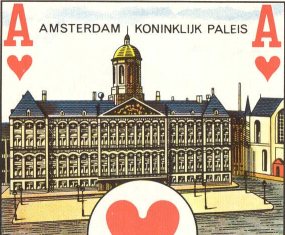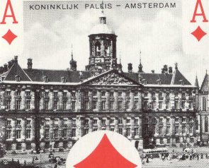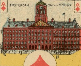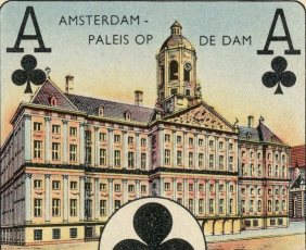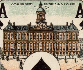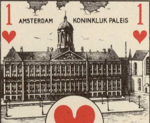 When the Royal Palace is depicted, the east side of the palace is usually shown. But the official address of the palace is the Nieuwezijds Voorburgwal 147. So the most depicted east side is in fact the backside of the palace. The ace here below is the only ace that shows the front of the palace too. It comes from a set of aces by Mesmaekers, Belgium, around 1930. The main entrance of the palace is in the extruding middle part of the building.