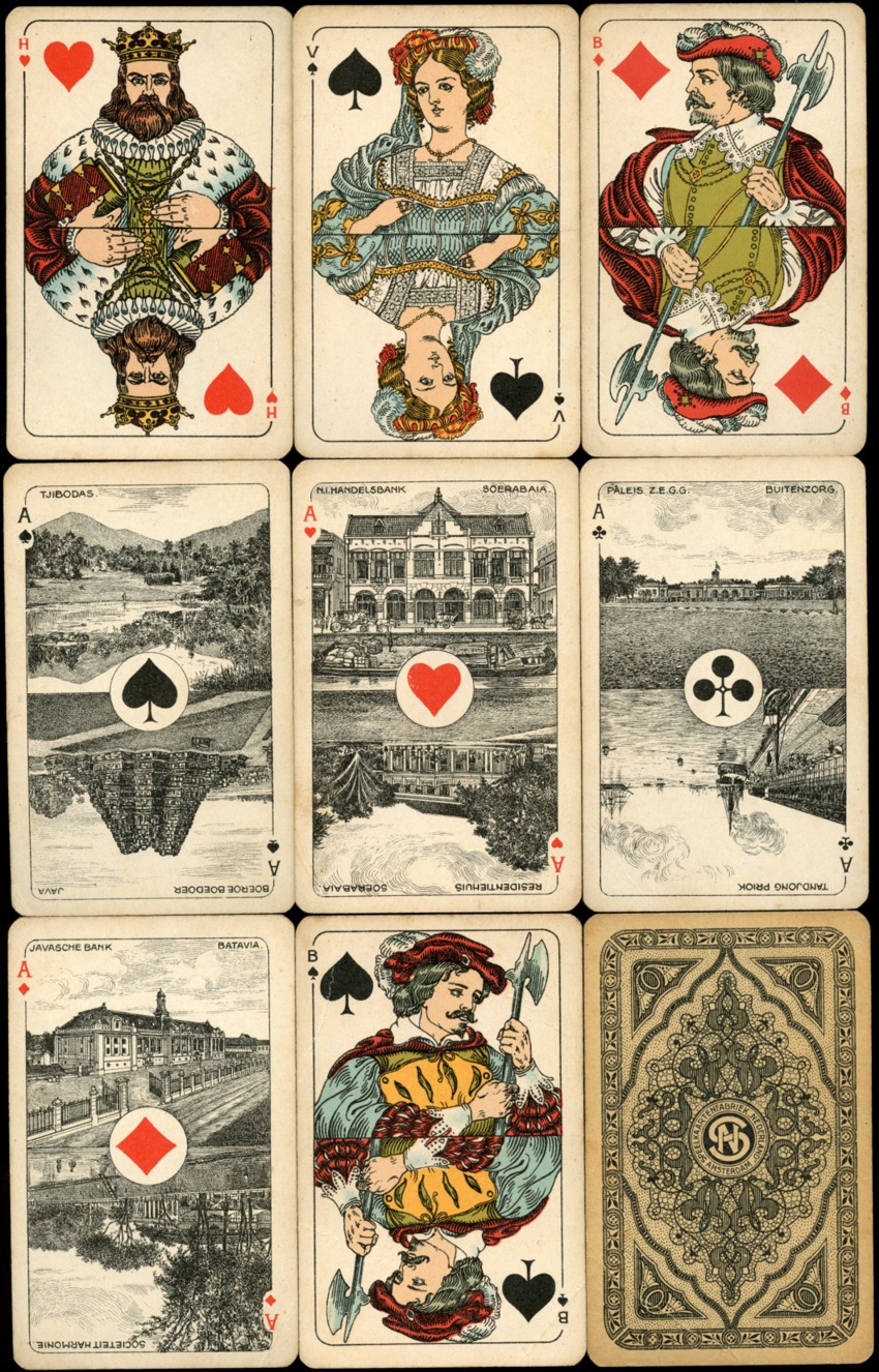 Here below a SN Export deck from around 1920. Export decks were not only published with this set of international aces, but also with a set with scenes from the Dutch Indies. Both sets also exist in a colored version. |