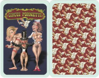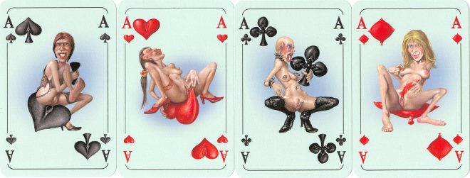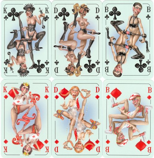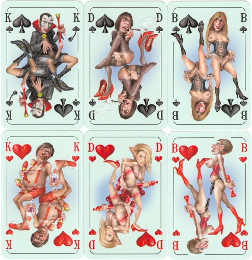 This deck was printed and published in Germany around 2005. The deck was designed by Wofgang Behrend (1944-2015). Each of the courts and aces shows an explicit erotic image, but drawn in the same comical style, which he has used in other (non-erotic) playing card decks.